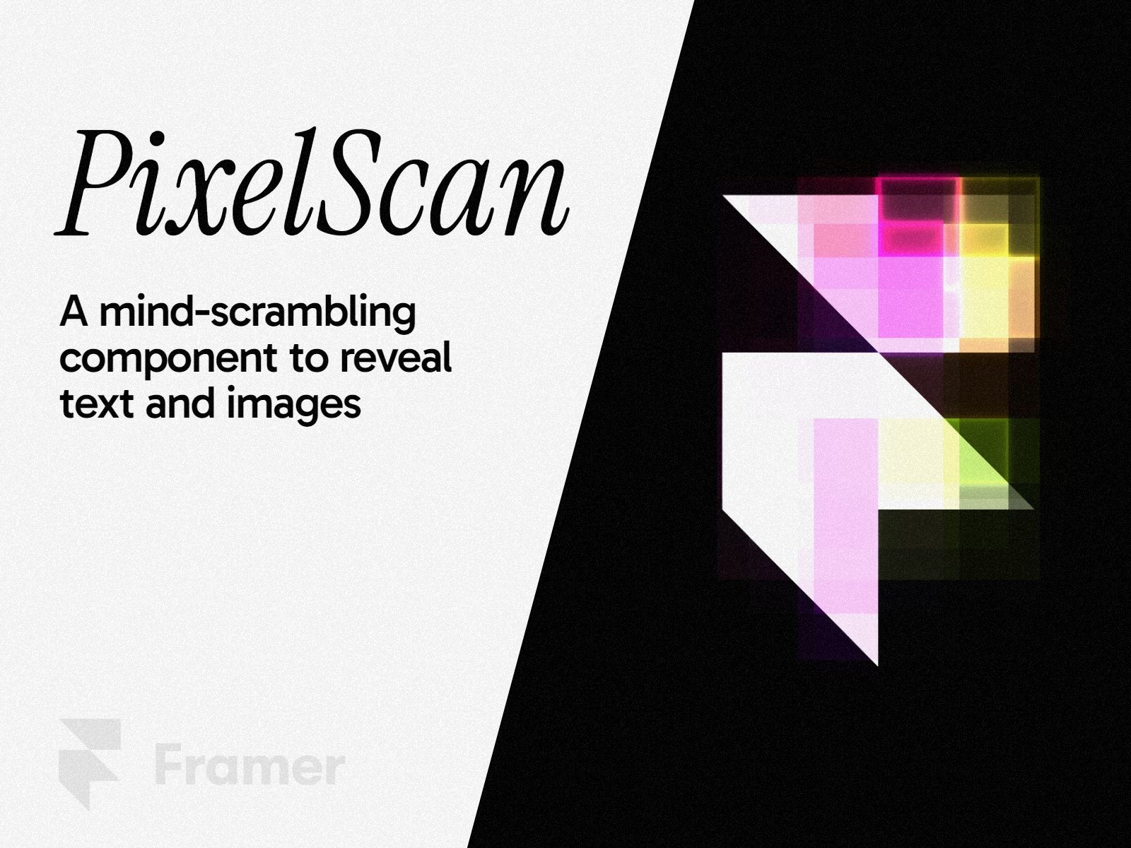 NEW! Get Access to All Components β You can now purchase a lifetime access to all my components. More information here. PixelScan β A unique component made for Framer website builder β It allows creators to reveal texts and images with a pixel scan effect. See examples The component comes with multiple options and presets such as 20+ colorways, speed control, pixel density, effect width, time delay and directional options. β Questions? Consult the FAQ section. Refund Policy Due to the nature of digital products, all sales are final and refunds cannot be provided. Please review all product details carefully before purchasing.