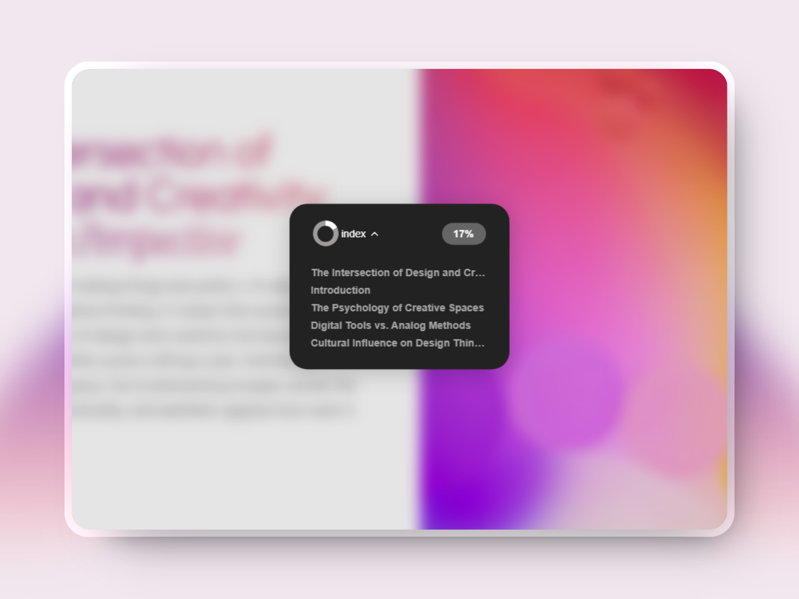 The perfect Table of Content for Framer, with a dynamic scroll progress bar. It retrieves automatically your HTML titles (h1, h2, h3, etc) and creates the table of content accordingly. Perfect for blog posts and other content-oriented web pages. Original idea by Nitish Khagwal Ported to Framer by Fred Moon π Live Preview https://scrollprogress.framer.ai/ π Updates Stay updated with more free components and new templates by following me on Twitter: twitter.com/fw3d π¨ My templates Hero Carousel: a mind-blowing display of scroll effects thatβs fun and budget-friendly!Polygon: a playful scroll experience with interactive elements π€ Hire Me Need help setting up my templates or my free components? Hire me for additional Framer support, reach out on Twitter twitter.com/fw3d or by email at [email protected].